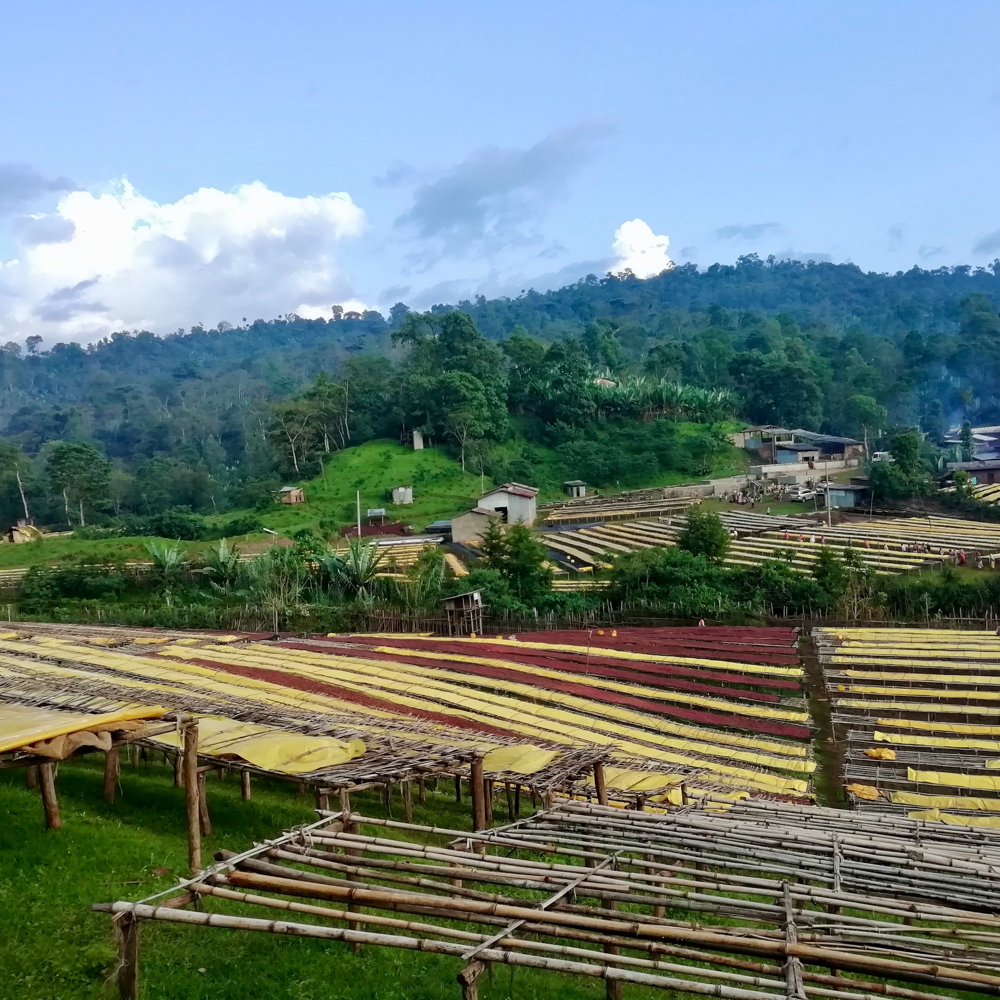 The coffee cherries come from many surrounding farms; they are rigorously hand-sorted to eliminate any visible defects before being pulped, washed with clear water, and then placed to dry on raised beds.